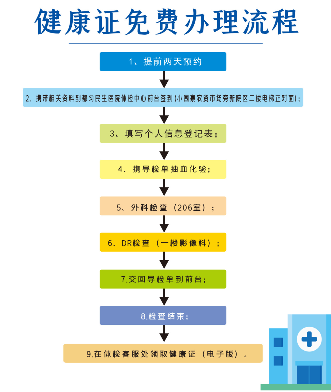 体检地点:都匀民生医院健康管理(体检)中心(小围寨农贸市场旁都匀民生医院新院区)都匀民生医院